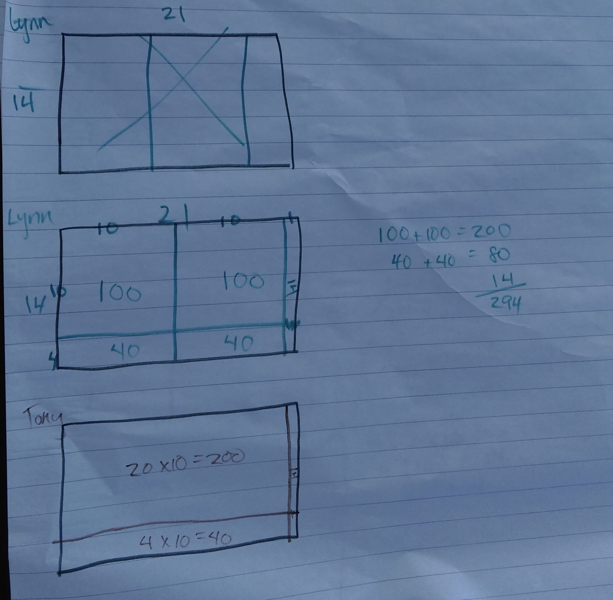 Now we see one power of a tool. If I had explicitly asked them to solve the multiplication problem 21 x 14, I would have had almost all identical column multiplication solutions, which aren’t ripe for rich discussions. But this little graph paper rectangle yielded a wide range of approaches, including two strategies that made beautiful sense, visually, but had almost no chance of emerging if we’d only worked with numbers:
