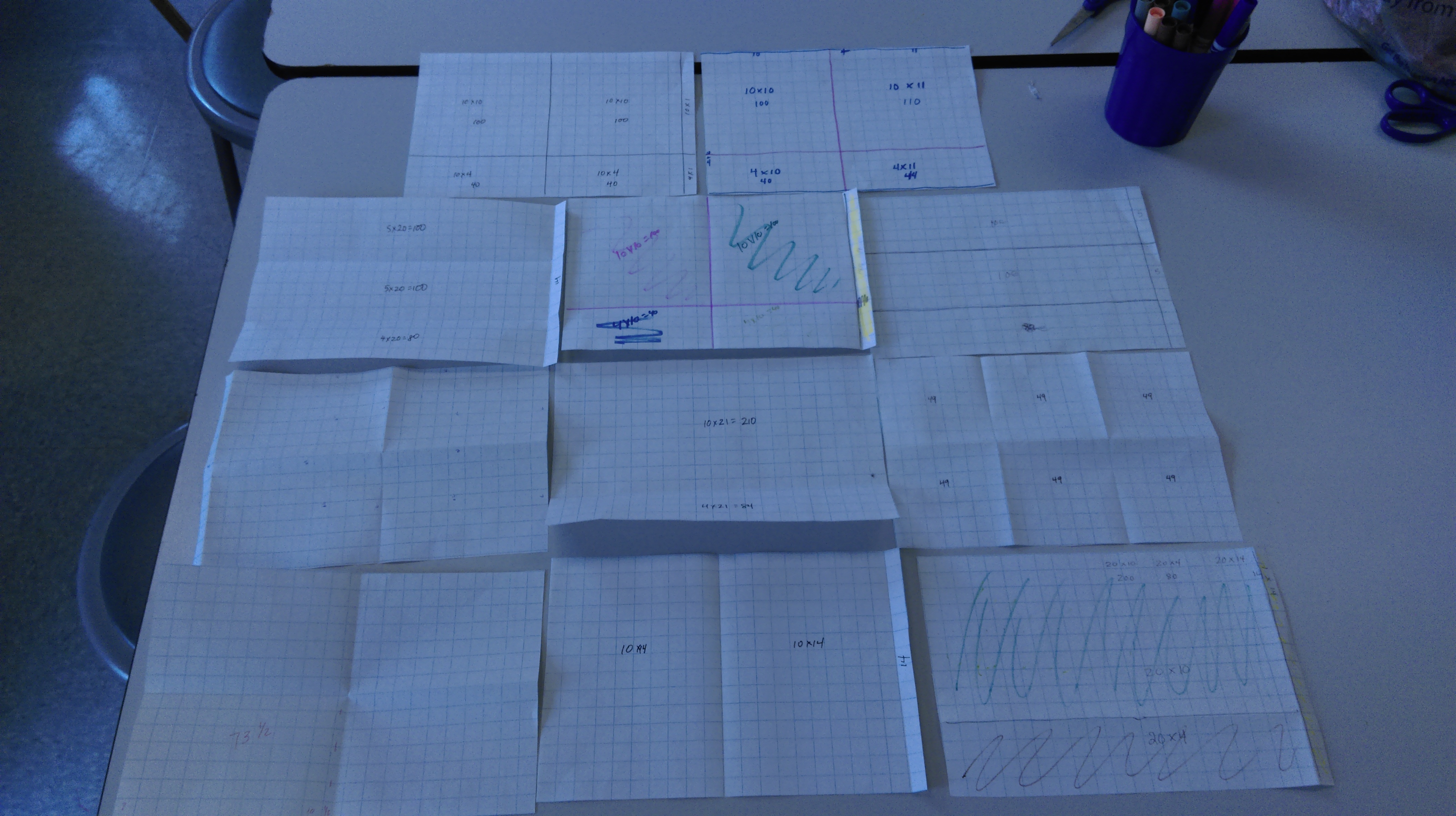 One observation I’d made over the year was that several parascolleagues openly despised both the area model and the related partial products strategy for multiplication. They didn’t understand why anyone would do that, and were resistant to multiplying any other way than the standard algorithm. As our year drew to a close, I wanted to devote time to multiplication of double-digit numbers and see if I could get anywhere with this animosity toward these two essential multiplication strategies. I knew that if I just drew or recorded the strategies with equations on chart paper, I would lose them. I’d learned that lesson the hard way, and wanted to avoid the shut down I’d caused before. So I needed something. I needed a tool that would unsettle our typical patterns.