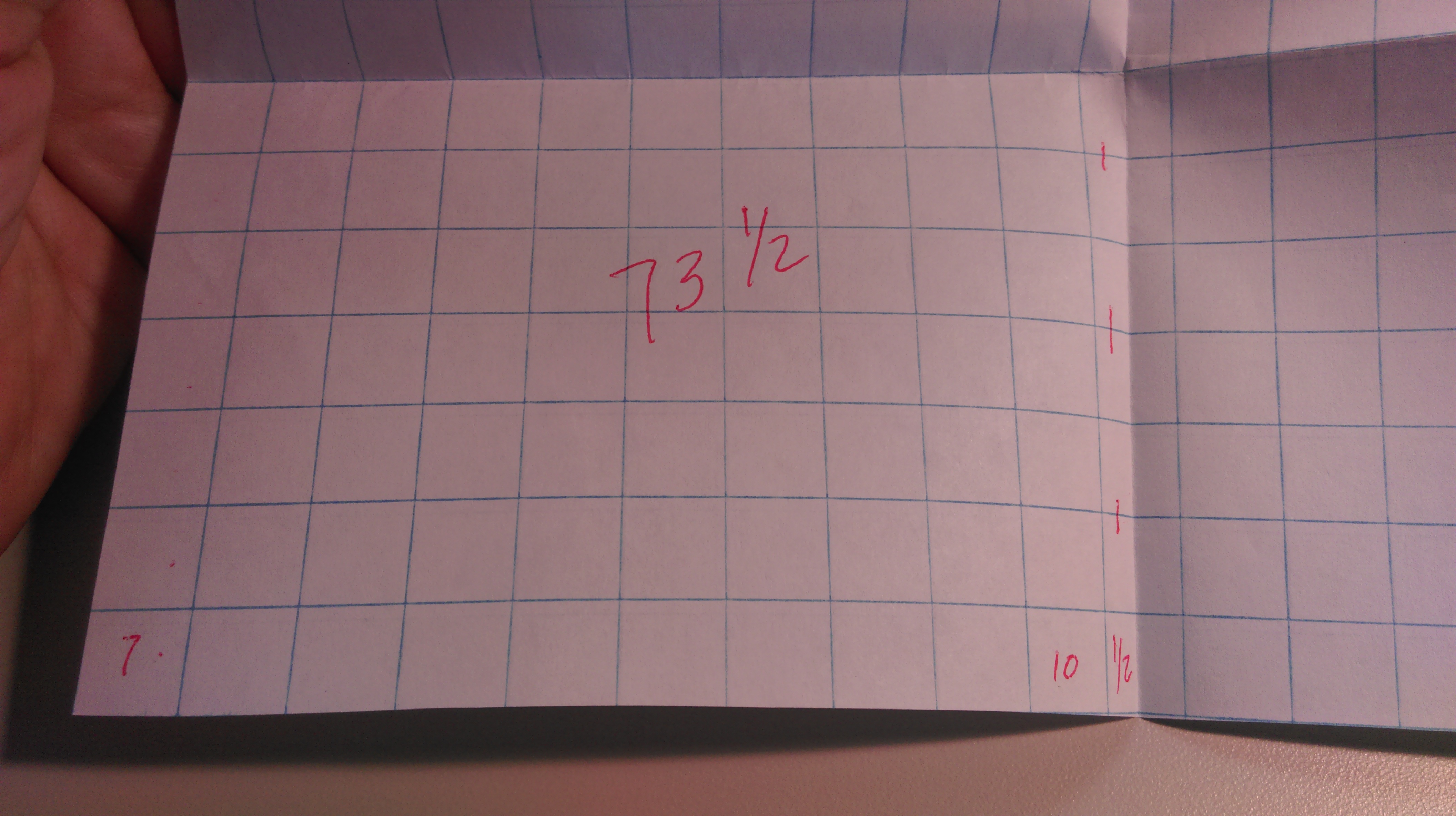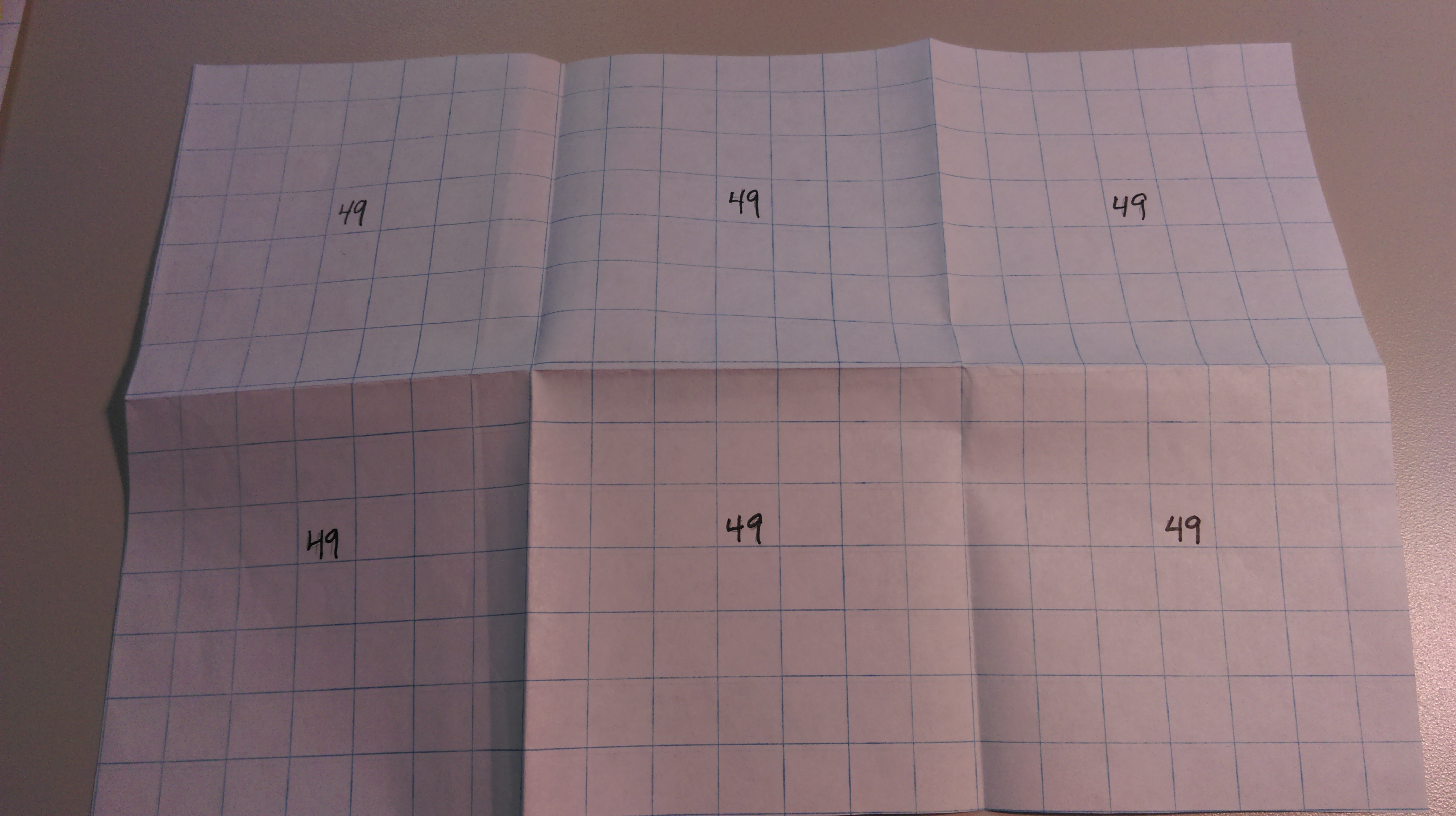 She had a 7 x 10 rectangle, which yielded 70 squares. She then combined 6 half-squares to make 3, and had 1/2 left over. Each quarter had 73 1/2 squares. To figure out the total number of squares, she pinched together the 4 half-squares into 2 whole squares, multiplied 73 x 4 to get 292, and added them together to find 294 squares. She told us that the folding grew out of her comfort with sewing, and she was completely in command of her strategy.